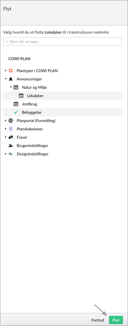 Klik på "Flyt" i panelet der fremkommer. Herefter vælges hvilken gruppe den valgte annonce skal flyttes til. Afslut ved at klikke på "Flyt" i højre hjørne af panelet.