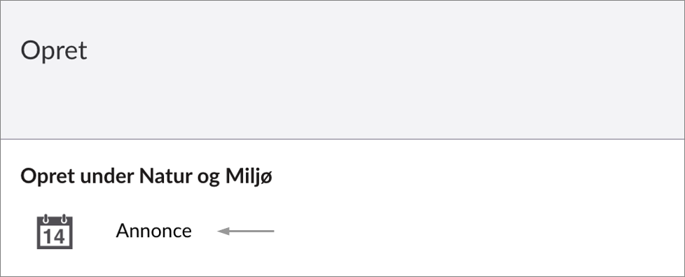 For at tilføje en ny annonce til en gruppe trykkes der på de tre prikker, der bliver synlige når musen svæver over den valgte gruppe. Klik på "Annonce" i panelet der fremkommer.
