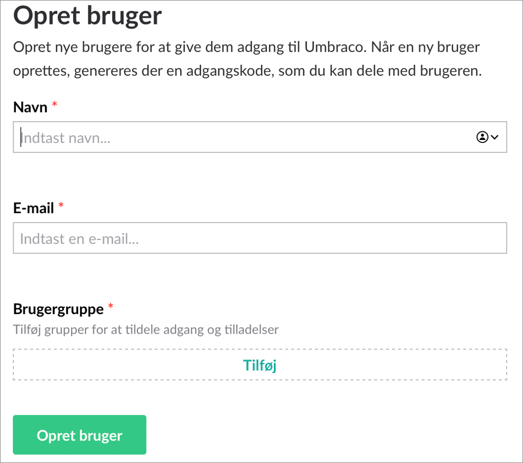 Forskellen på de to funktioner er, at der ved brug af "Invitér bruger" vil blive sendt en invitation til den angivne e-mail med oplysninger om, hvordan man logger ind i Umbraco.