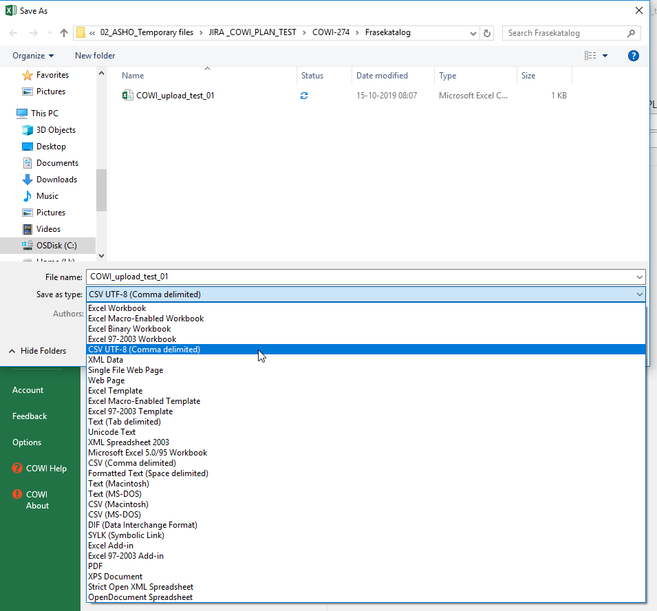 Når fraserne er arrangereret i et Excel-ark og ovestående regler er overholdt gemmes arket via Gem som-protokollen som en .csv fil med UTF-8 encoding.