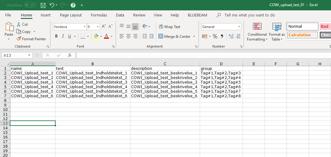 NB: Det er ikke muligt at lave linjeskift eller ombryd tekst i cellerne. Hvis man ønsker linjeskift eller afsnit i en frase er det nødvendigt at redigere frasen direkte i COWI PLAN, efter import. Importen understøtter ej heller formatering af tekst f.eks. farve, bold og italic.