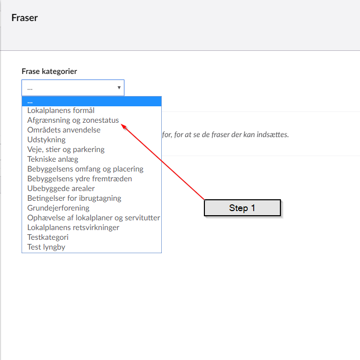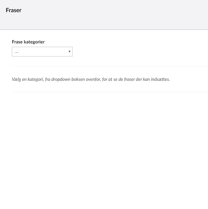 Skridt 1 - Vælg den kategori som du ønsker at indsætte fraser fra via drop down-menuen i Indsæt frase-dialogen.