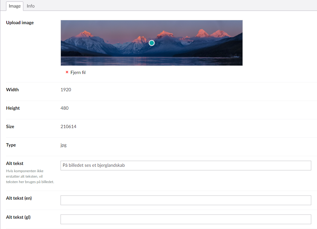 Alternative tekster tilføjes ved at tilgå et billede i mediearkivet og indsætte teksten under "Alt tekst".
