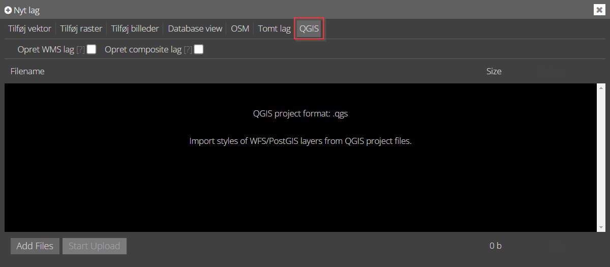 QGIS-projektet importeres i GC2 ved at vælge "Nyt lag". Herefter vælges fanen "QGIS" og .qgs-filen kan tilføjes ved at trække/slippe filen eller ved at klikke på "Add files". Klik herefter på "Start upload".
