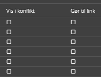 Listevisningen har en kolonne med titlen "Skip conflict". Her kan der sættes flueben ved de lag der ikke ønskes medtaget i konfliktsøgeren.