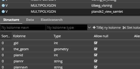 Når der klikkes på et lag i listen, vises inddelingen af lagets attributtabel i nederste vindue under menupunktet "Structure".