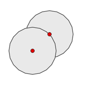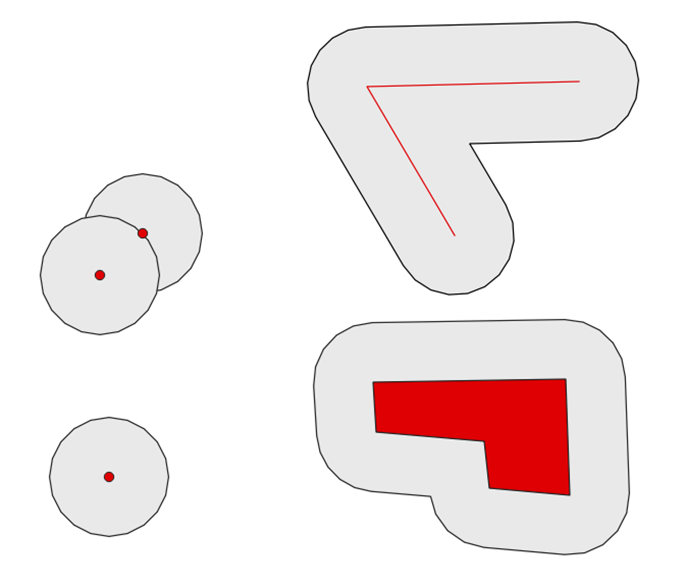 Værktøjet "Buffer" virker på vektorlag med punkter, linjer eller polygoner. Værktøjet tilfører polygoner der omslutter de enkelte objekter i et vektorlag med en given afstand omkring objektet. Billedet nedenfor viser eksempler på de forskellige objekttyper med en buffer.