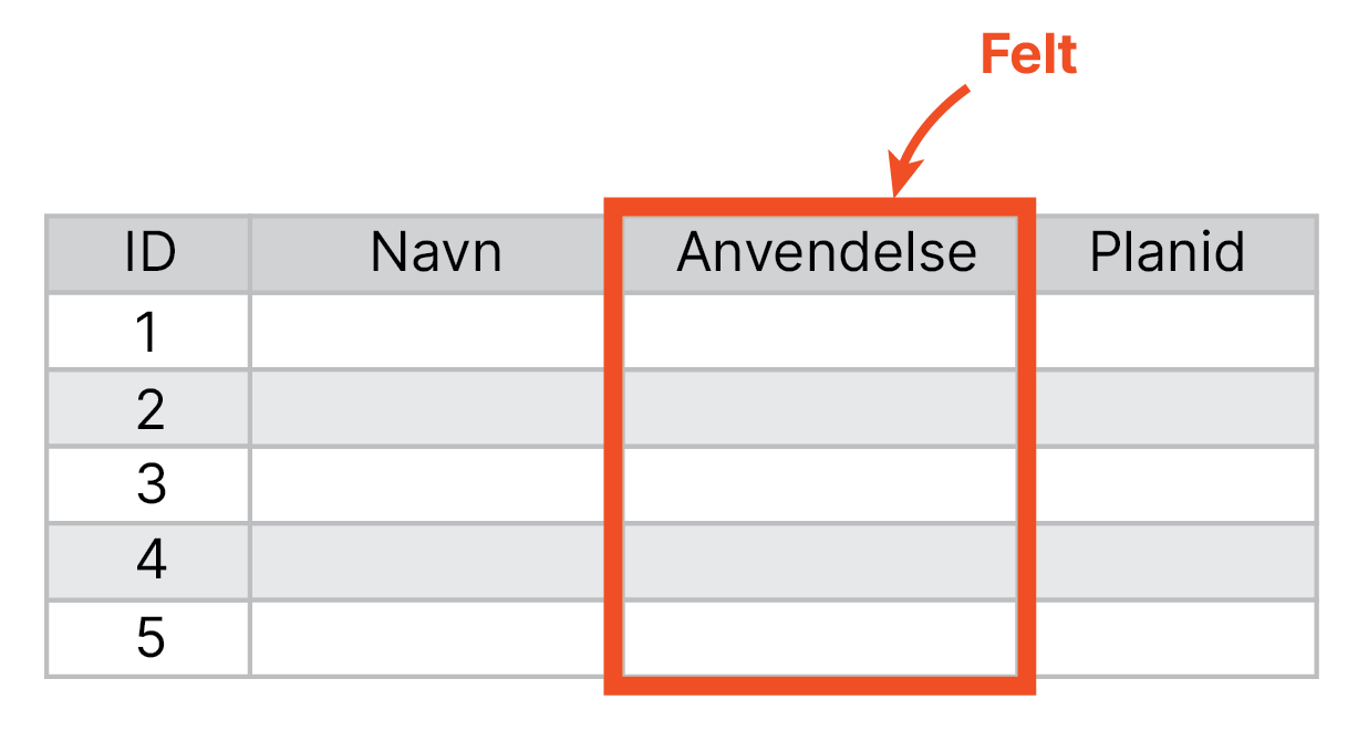 En kolonne i attributtabellen benævnes et felt og kan identificeres ud fra dets navn. Derudover er et felt karakteriseret ved at have en bestemt type, alt efter typen af værdier det indeholder. Her kan der være tale om tekst, heltal, decimaltal eller datoer.
