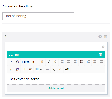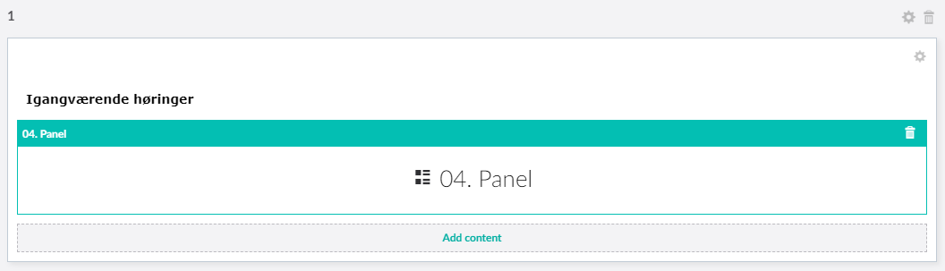 Angiv høringens navn som titel på panelet og tilføj herunder indholdstypen "Tekst". Her indsættes den beskrivende tekst til høringen.